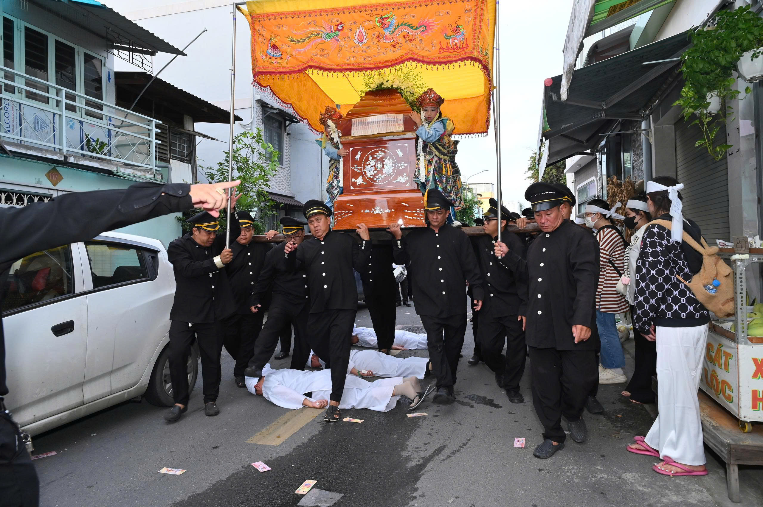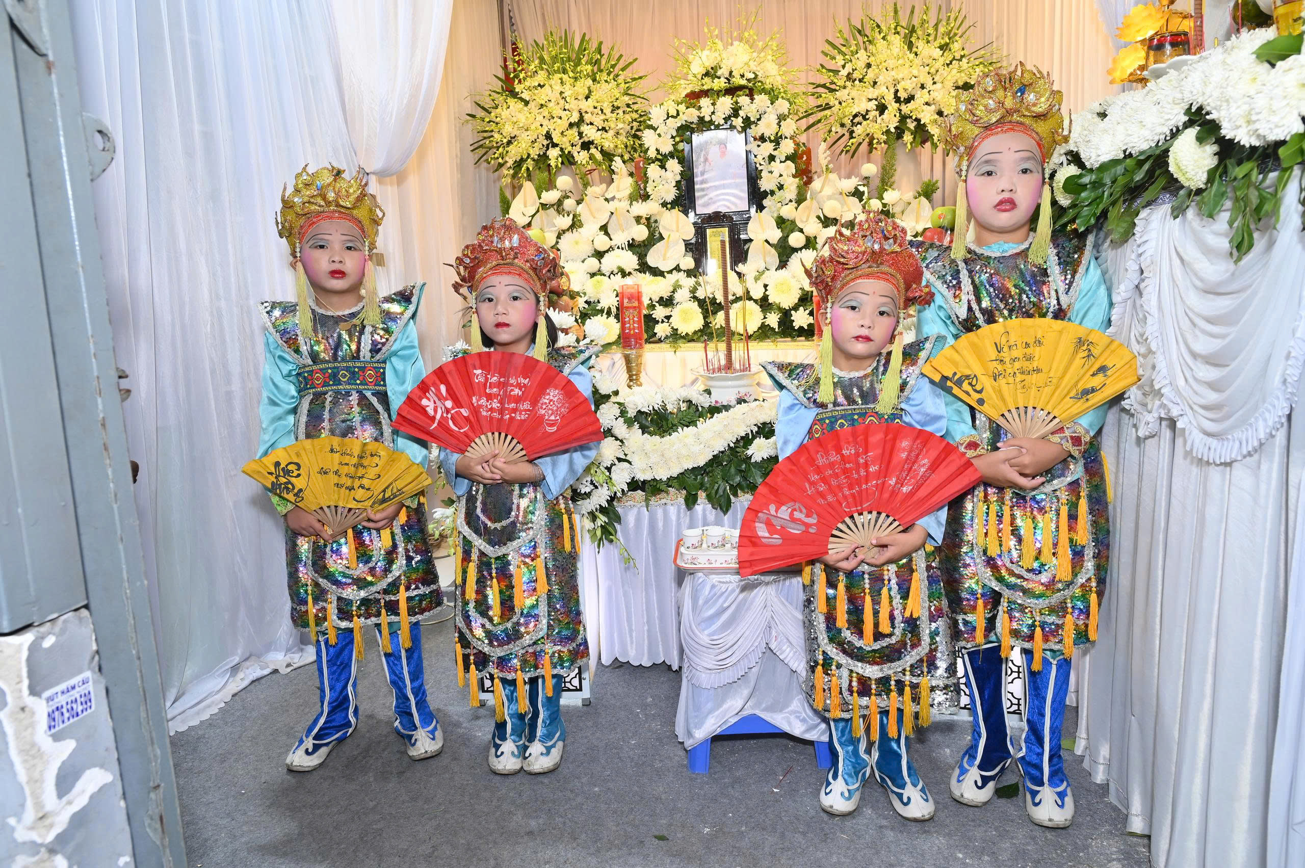Bốn cô Đào trong trang phục lễ nghi trang trọng, tay cầm quạt hoa văn, bước đi khoan thai theo nhịp nhạc tang lễ. Hình ảnh ấy vừa mang tính biểu trưng nghệ thuật, vừa khơi gợi sự thanh tịnh, trang nghiêm – như một lời tiễn biệt trọn vẹn, cầu chúc hương linh sớm an yên nơi cõi vĩnh hằng.